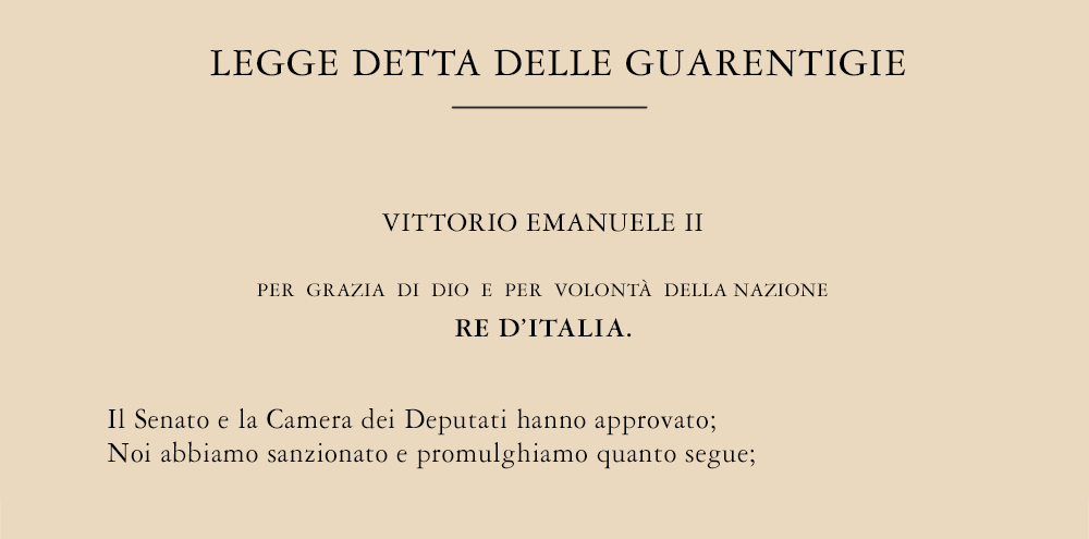 Il 13 maggio del 1871 venne promulgata la Legge sulle Guarentigie, il primo provvedimento normativo italiano in materia di diritto al culto con effetto diretto sulla Chiesa Cattolica oltre che sulla stessa persona del Papa.