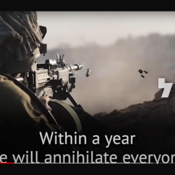 “La notte d’autunno scende sulla spiaggia di Gaza, gli aerei bombardano, distruggono, distruggono”, cantano i bambini con voci angeliche. “Entro un anno annienteremo tutti, e poi torneremo ad arare i nostri campi”.