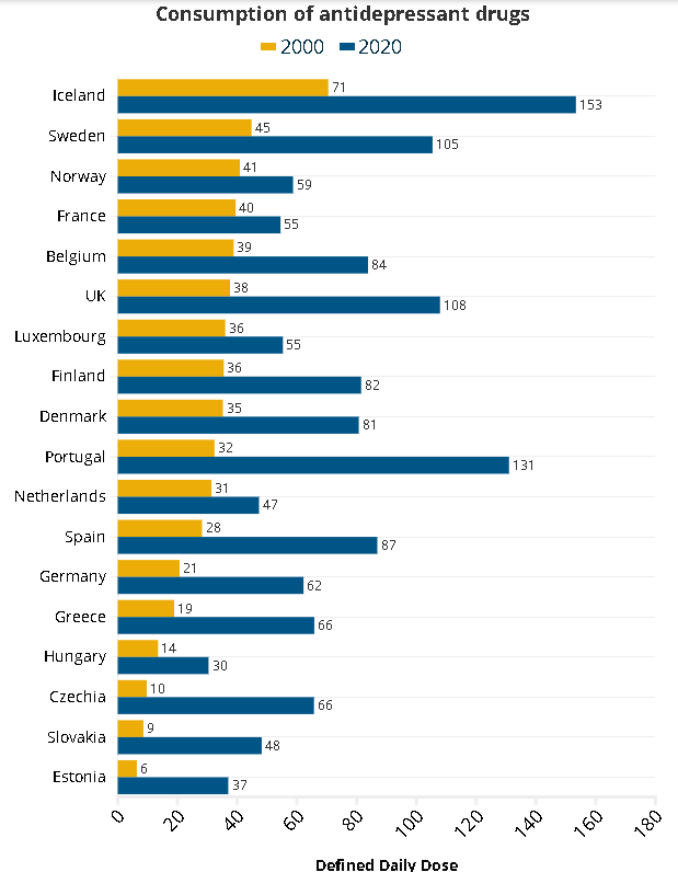 Secondo il Report mondiale sulla felicità nel 2020 l’Islanda figurava al secondo posto per Paese più felice mentre la Svezia era in sesta posizione. La Finlandia era la nazione più felice e la Lettonia, che nel report OCSE ha il consumo più basso di medicinali contro la depressione, era 34esima.