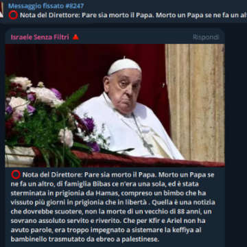 Nel giorno in cui il mondo intero si ferma per la scomparsa di Papa Francesco – uomo di pace, di parola, di dialogo – una frangia estremista e sionista infanga la memoria, l’umanità e la coscienza. Non è solo odio: è strategia. È il volto scoperto del fanatismo israeliano in Europa, ed è tempo di […]